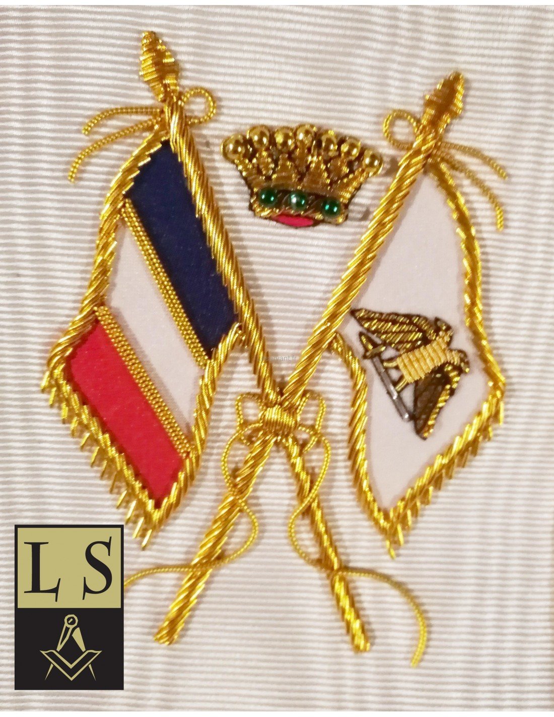 Collier de Grand Commandeur SCFDF Pièce exceptionnelle. Entièrement brodé à la main Tissus moiré blanc avec bordure or Fils d'or et incrustations de pierres non précieuses Pièce réalisée à la demande et selon un modèle ancien Pour ces pièces de prestiges, nous sommes en mesure de réaliser des décors exceptionnels et spécifiques à votre rite et obédience. Merci de nous consulter.