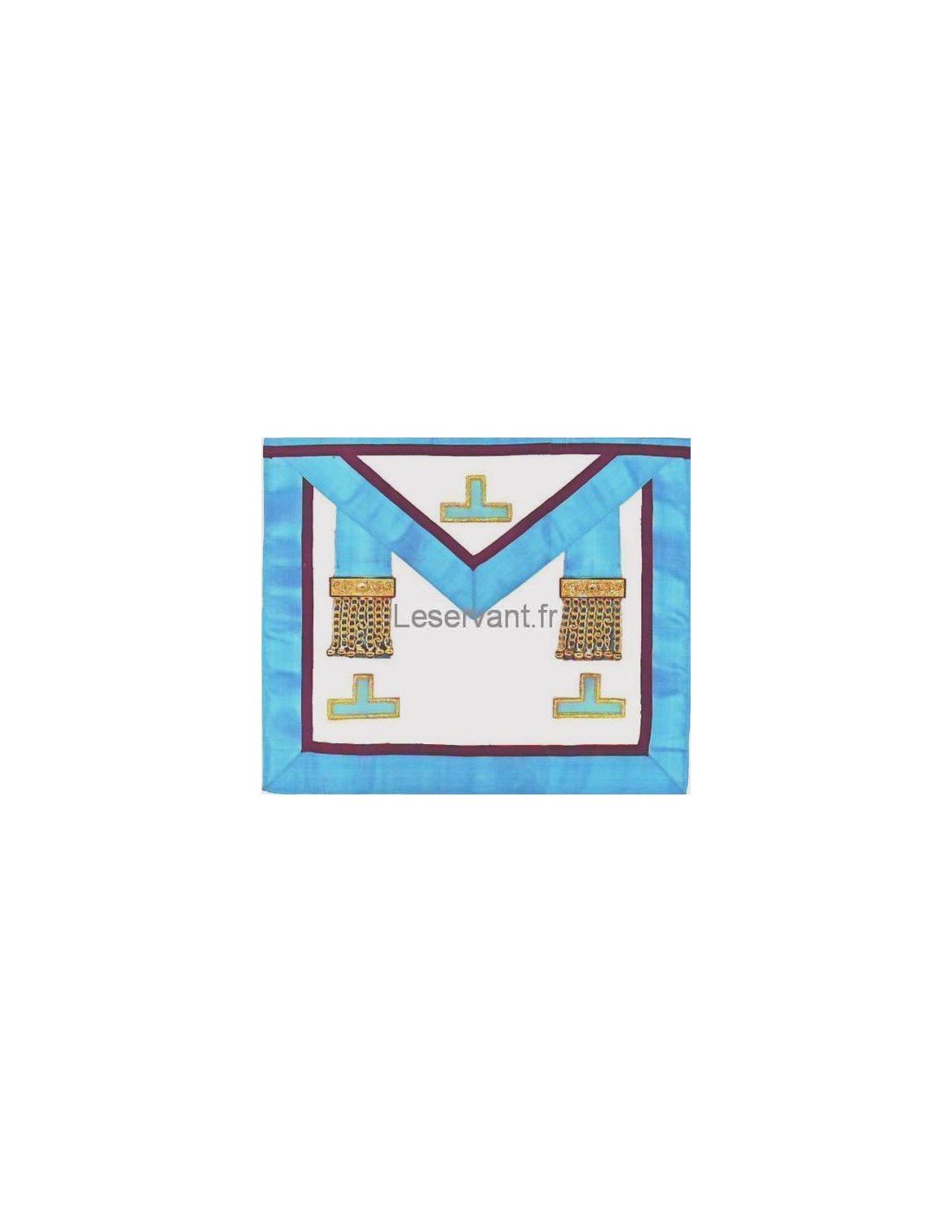 Tablier en cuir .Tissus bleu turquoise moiré 3 taus et pendeloques Dos noir avec symboles et poche pour les gants