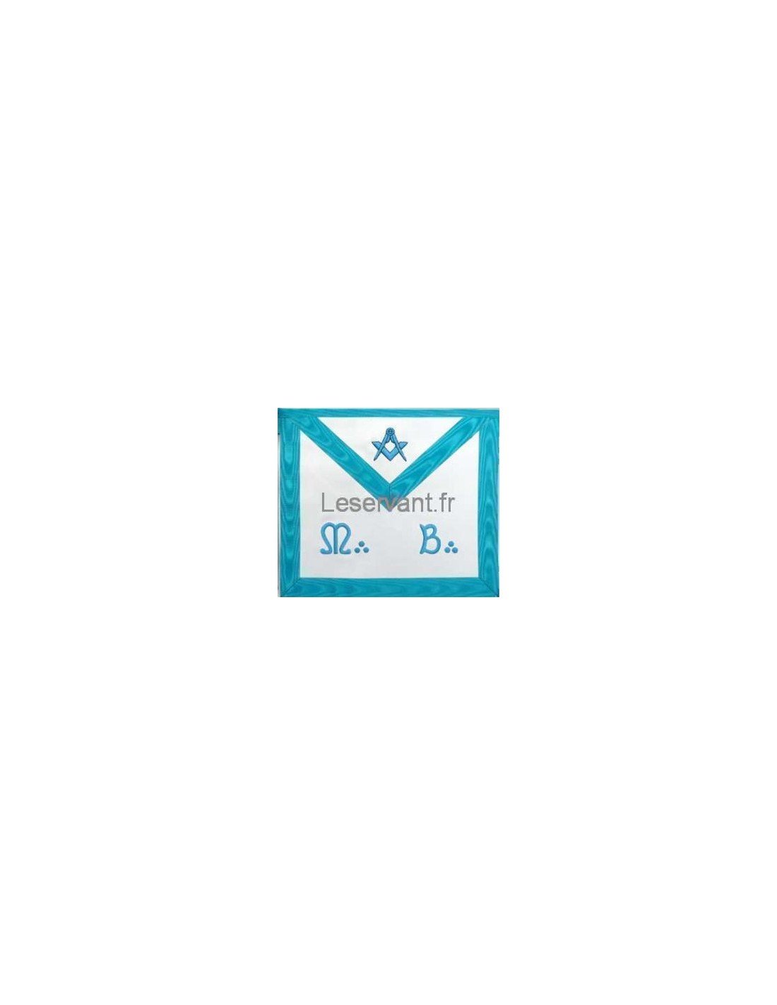 Tablier Maître Rite Français Groussier Tablier cuir blanc Broderie M:.B:. , compas équerre Tissus moiré bleu turquoise Dos noir avec symboles avec poche pour gants Ceinture noire attache serpent doré